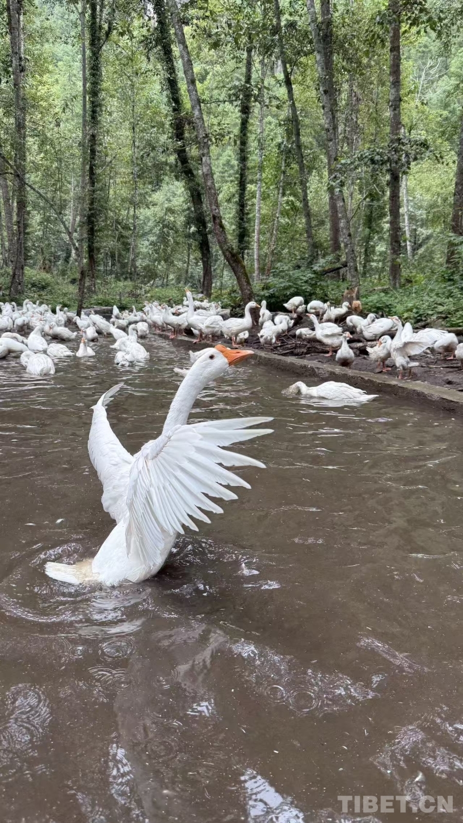 圖為撲棱著翅膀在水塘中嬉戲的大白鵝 仁青旺姆供圖