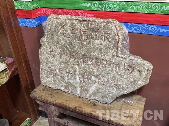 如今,松安寺內(nèi)有一座專門設(shè)立的紅色文物陳列室,長青介紹道,這座紅色文物陳列室是現(xiàn)任活佛羅讓甲央在當?shù)卣С窒禄I建而成。陳列室廣泛收集了有關(guān)紅色文物進行集中展示,供僧眾和信教群眾參觀學習。有一塊石刻被視為“鎮(zhèn)館之寶”,上面刻著毛主席的語錄“我們所做的一切都是為人民服務(wù)”。石刻是寺廟在維修僧房時從房基下發(fā)現(xiàn)而挖出的,年代久遠,也見證了歷史里精神的傳承。