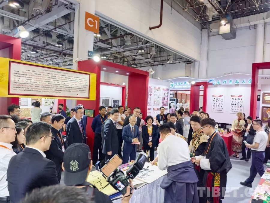 圖為西藏民族大學(xué)扎西曲吉參加第十六屆海峽兩岸(廈門)文化產(chǎn)業(yè)博覽交易會(huì),現(xiàn)場(chǎng)書寫“團(tuán)結(jié)統(tǒng)一”的漢藏雙語書法作品并做講解