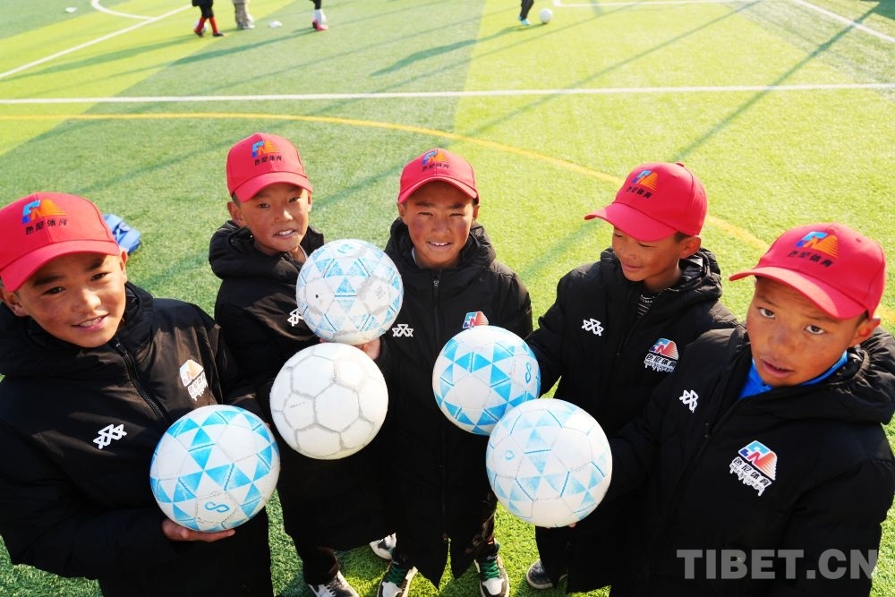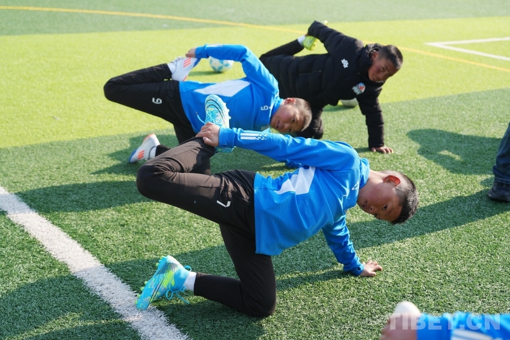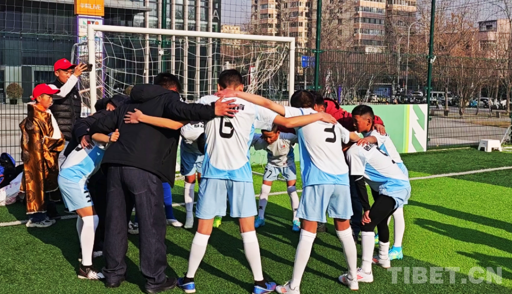 盡管正值寒冬,西藏的足球少年們已經迫不及待地換上球服開始跑動熱身。帶隊教練和球員們圍成圓圈,團抱在一起,大喊加油!