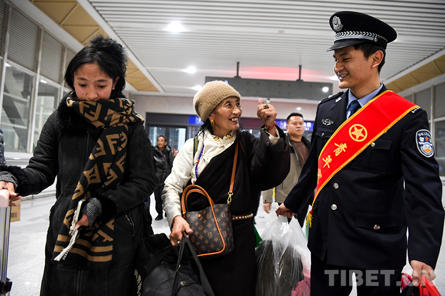 圖為身著藏藍、肩披紅綬帶的格爾木鐵路公安民警幫助返鄉(xiāng)的藏族阿媽踏上春運旅途