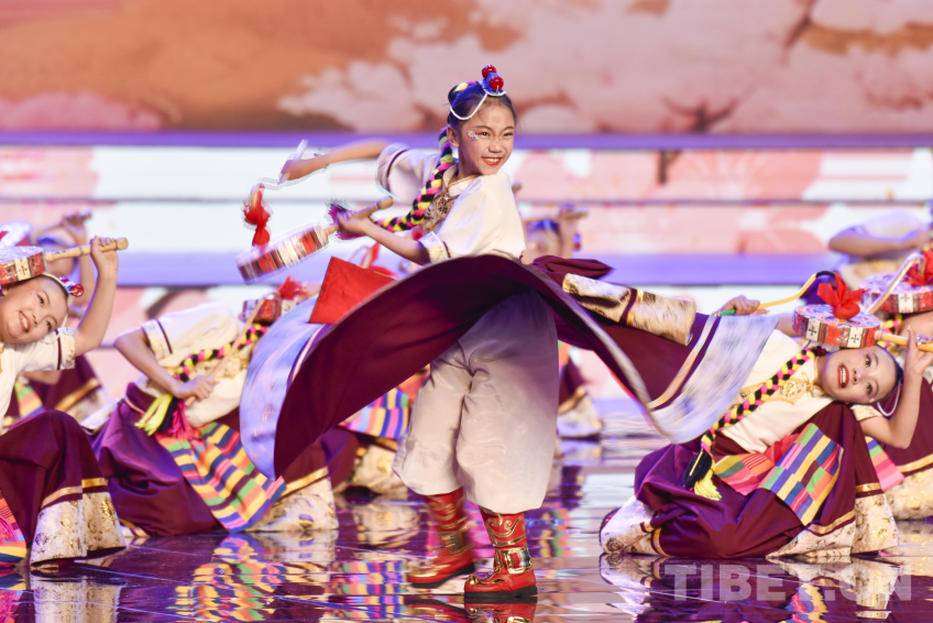 圖為2026拉薩藏晚節(jié)目少兒舞蹈《鼓舞新時(shí)代》丹增珍美(中)與小伙伴一起為大家?guī)?lái)精彩熱巴舞 攝影:趙振宇