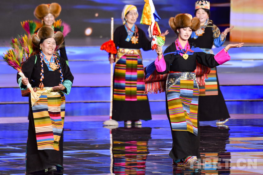 圖為2026拉薩藏晚節(jié)目《村“T”服飾秀》阿佳央金(左)與村民一起為大家?guī)?lái)精彩傳統(tǒng)走秀 攝影:趙振宇