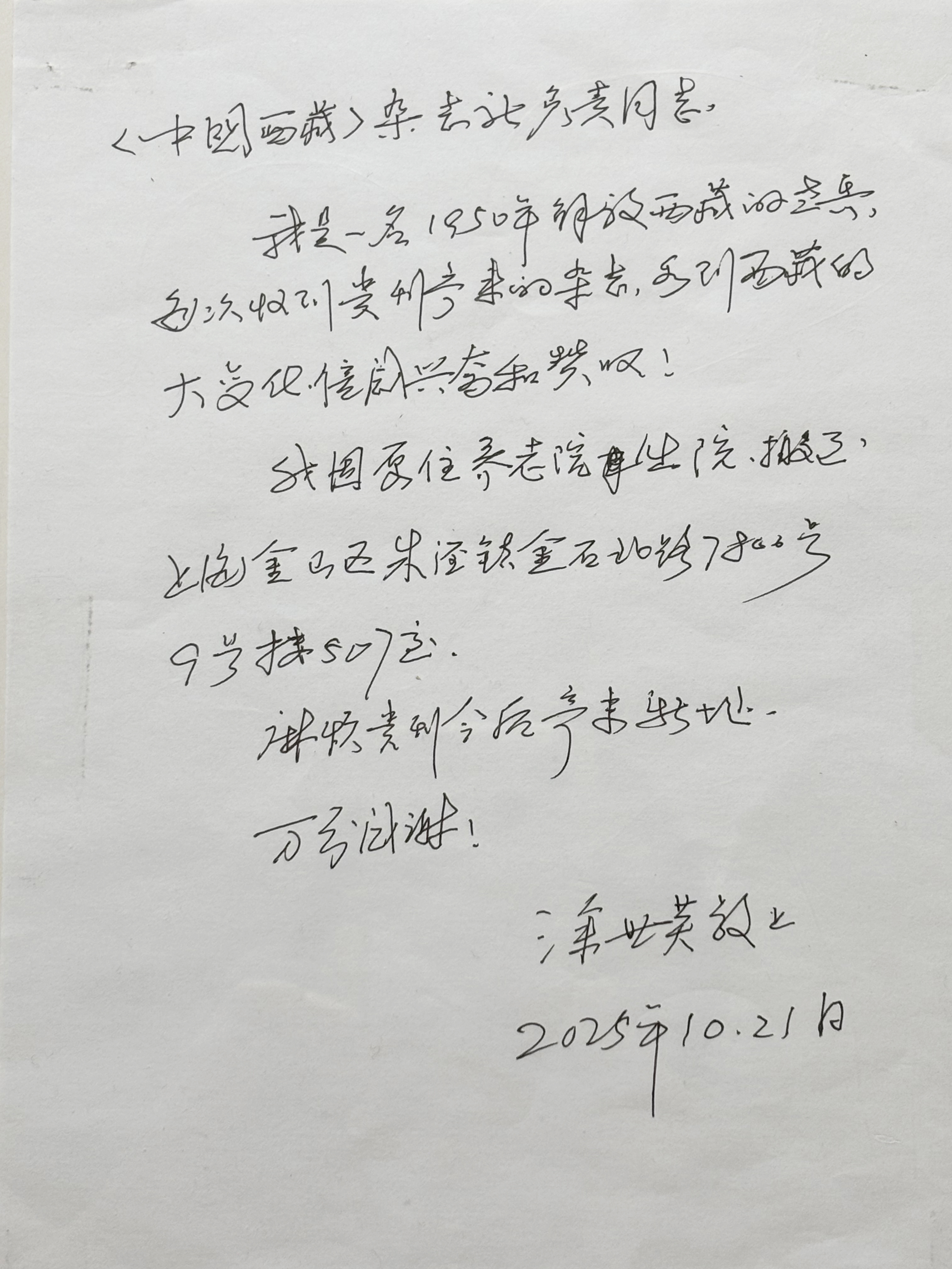 涂世英老先生,見(jiàn)字如面。您的來(lái)信,《中國(guó)西藏》雜志編輯部已完整收悉,心中滿是敬意與溫暖。我們深知,您是1950年便投身于解放西藏偉大事業(yè)的老兵,是雪域高原和平解放的親歷者、見(jiàn)證者,是用青春與熱血守護(hù)這片土地的先行者。歲月流轉(zhuǎn),您始終未曾放下對(duì)西藏的牽掛,每一次收到本刊,都為這片高原翻天覆地的變化感到由衷興奮和贊嘆。這份跨越時(shí)光的關(guān)注,讓我們每一位編輯都深受觸動(dòng)。