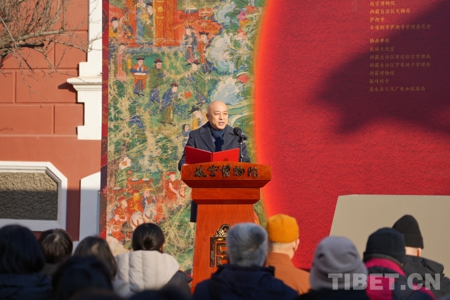 展覽開幕式現(xiàn)場,文化和旅游部黨組成員、故宮博物院院長王旭東,西藏自治區(qū)人民政府黨組成員、副主席徐志濤,故宮博物院原院長鄭欣淼,中國文物保護基金會理事長劉玉珠,中國佛教協(xié)會會長演覺,中國古跡遺址保護協(xié)會理事長宋新潮,國家民族事務委員會古籍整理研究室一級巡視員孫繼為,故宮博物院黨委書記、副院長都海江,文化和旅游部非物質文化遺產(chǎn)司二級巡視員張玲,西藏自治區(qū)人民政府辦公廳二級巡視員旦巴央培,西藏自治區(qū)文化廳黨組成員、西藏自治區(qū)文物局黨組書記、副局長趙興邦,全國政協(xié)委員、薩迦寺寺管會常務副主任洛卓加措,香港賽馬會慈善事務部主管葉巧兒出席。文化和旅游部、國家文物局下屬文博單位,西藏自治區(qū)人民政府下屬相關單位,北京市人民政府下屬相關單位,本次展覽的獨家捐助方公益慈善研究院,相關協(xié)會、學會、基金會,各參展單位,特邀相關業(yè)務合作單位等也現(xiàn)場出席。