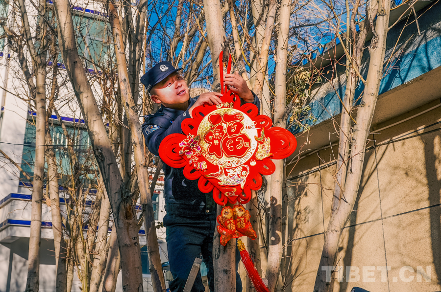 圖為民警在樹上掛春節(jié)裝飾