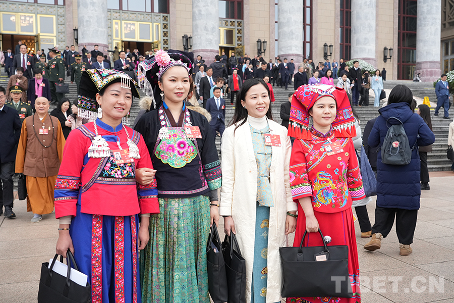 中國(guó)西藏網(wǎng)訊 3月5日上午,十四屆全國(guó)人大四次會(huì)議在人民大會(huì)堂開(kāi)幕。開(kāi)幕會(huì)后,身著民族服飾的人大代表們信心滿懷走出會(huì)場(chǎng)。(中國(guó)西藏網(wǎng) 記者/邊子捷 劉莉)