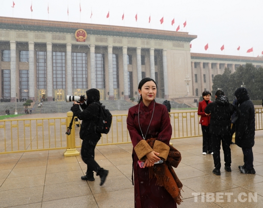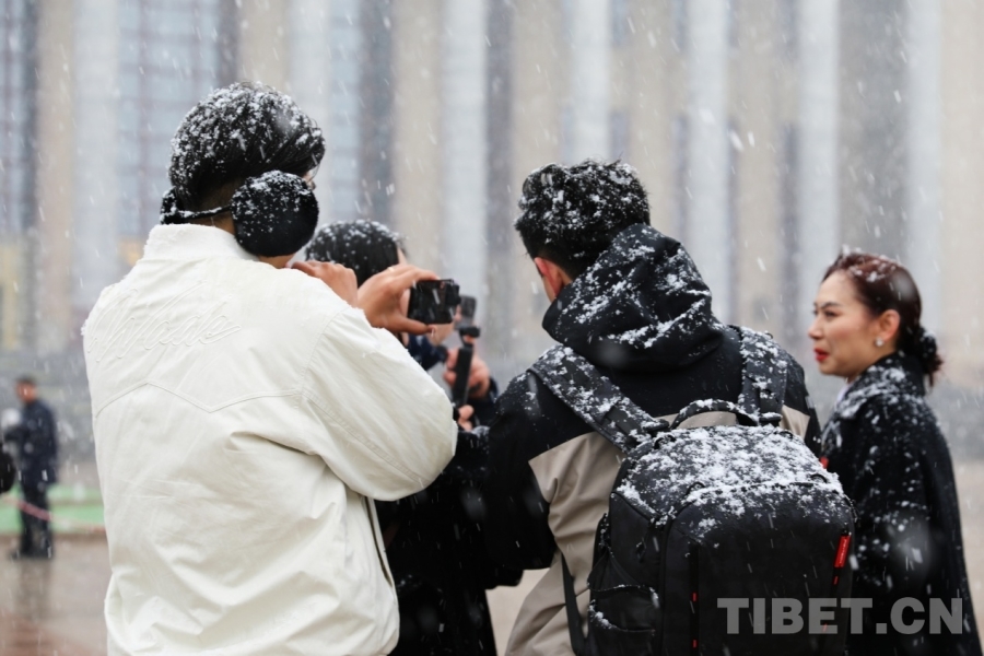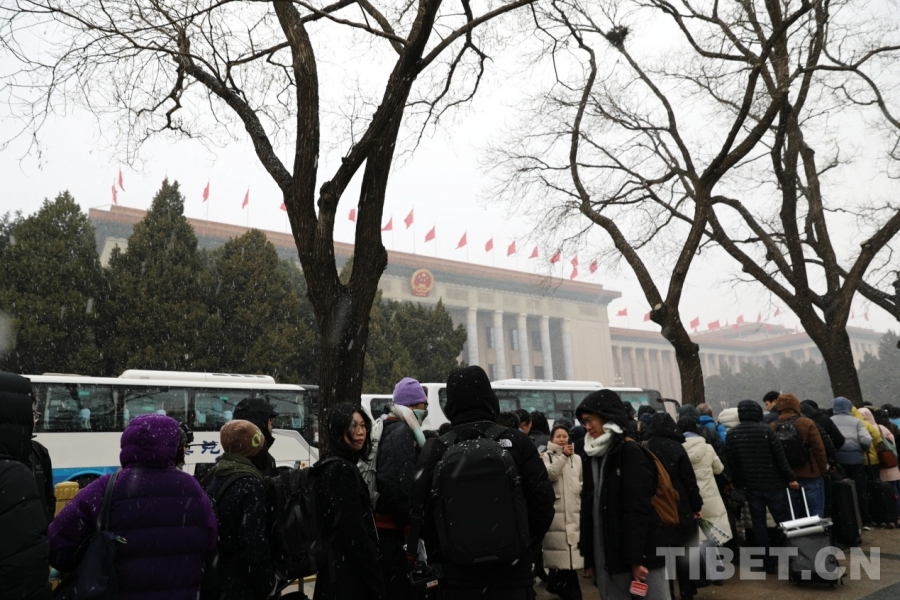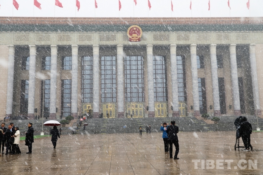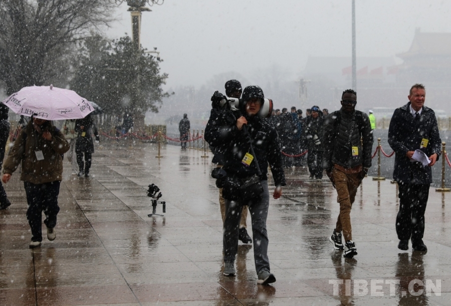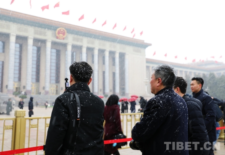 3月4日上午,十四屆全國人大四次會(huì)議舉行預(yù)備會(huì)議。會(huì)議結(jié)束后,一場春雪不期而至。在紛揚(yáng)的大雪中,康巴衛(wèi)視記者正在工作。攝影:劉莉