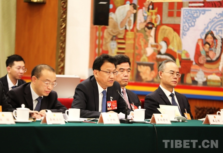 全國人大代表,西藏自治區(qū)拉薩市市長王強(qiáng)(前排左三)發(fā)言