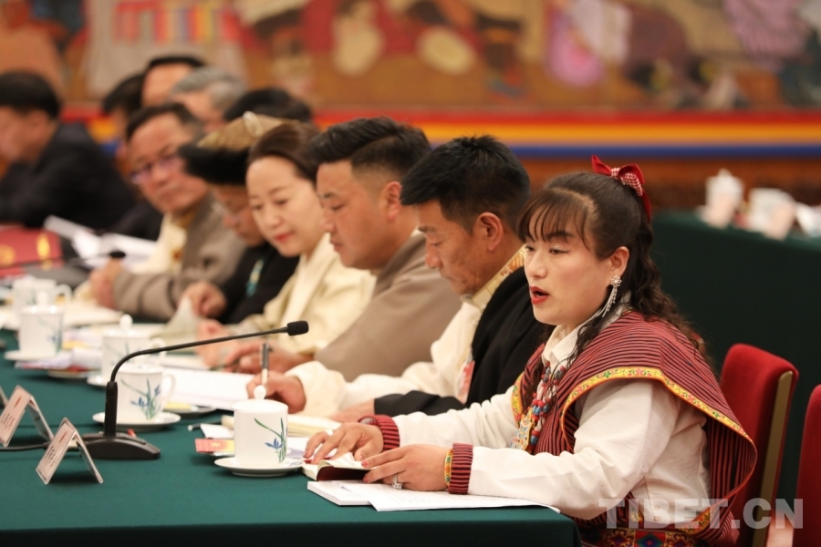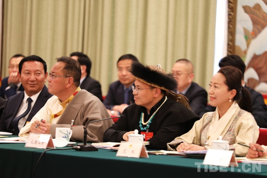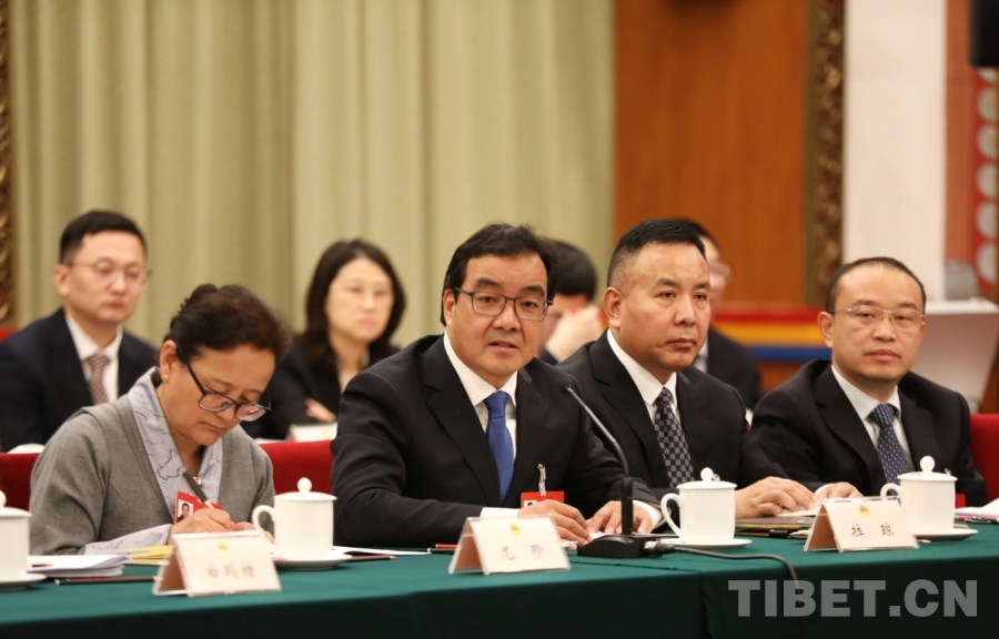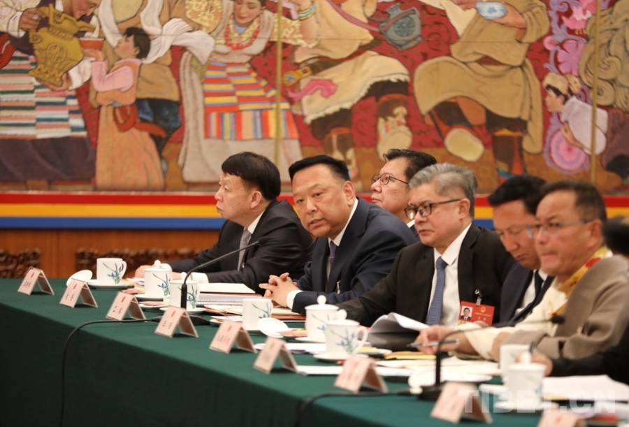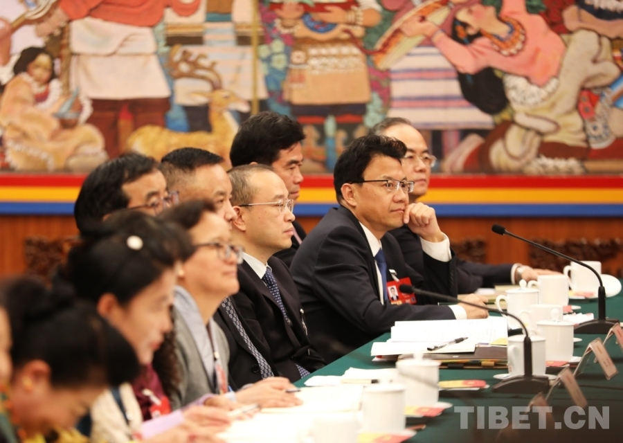 全國人大代表、西藏自治區(qū)阿里地委書記索南丹增(前排左二)發(fā)言