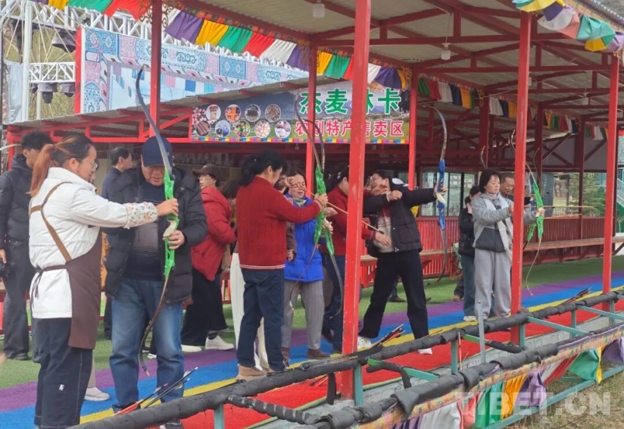 旅行團(tuán)參與射箭等林卡特色互動(dòng)項(xiàng)目