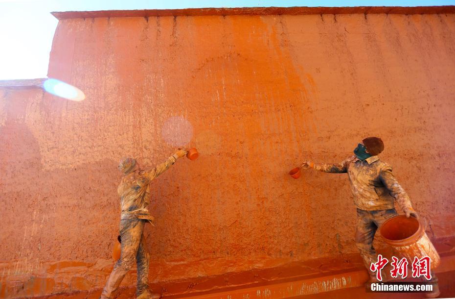 11月9日,甘肅夏河縣拉卜楞寺內,匠人用傳統(tǒng)潑灑方法為寺院墻壁“美顏”。中新社記者 高展 攝