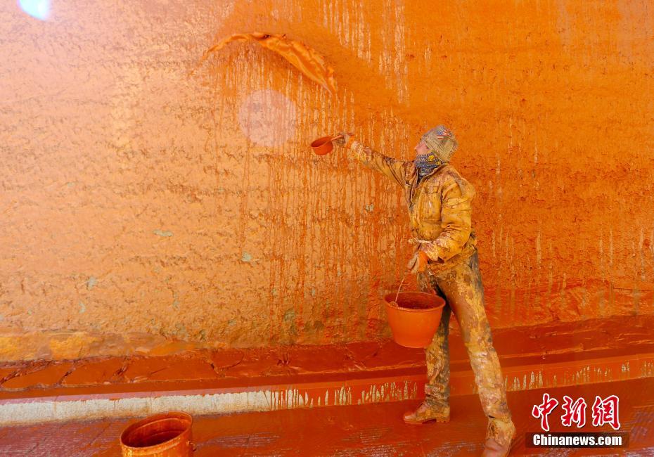 拉卜楞寺用傳統(tǒng)潑灑法為寺院墻壁“美顏”