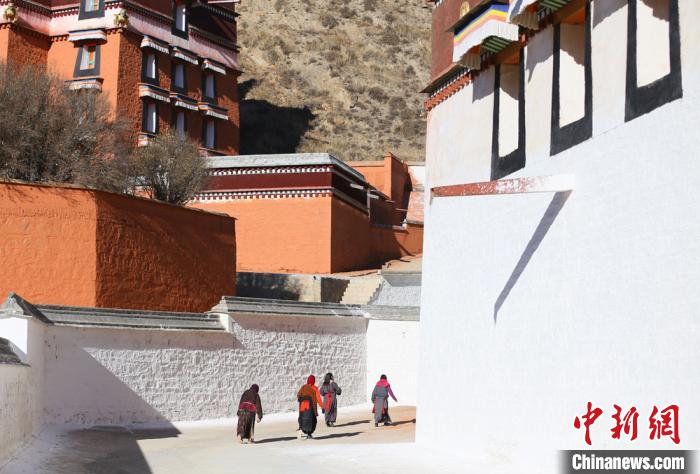 11月上旬,冬日的拉卜楞寺,陽光灑落在黃色、紅色、白色的院墻上,忙碌的工匠裹著頭巾,用傳統(tǒng)潑灑方法為寺院院墻“美顏”;路過的僧人踏著匆忙的腳步前往佛殿,繼續(xù)一日的課程;來往的游客穿梭在寺院各個(gè)巷道間,虔誠(chéng)感受這所“世界藏學(xué)府”的獨(dú)特魅力。