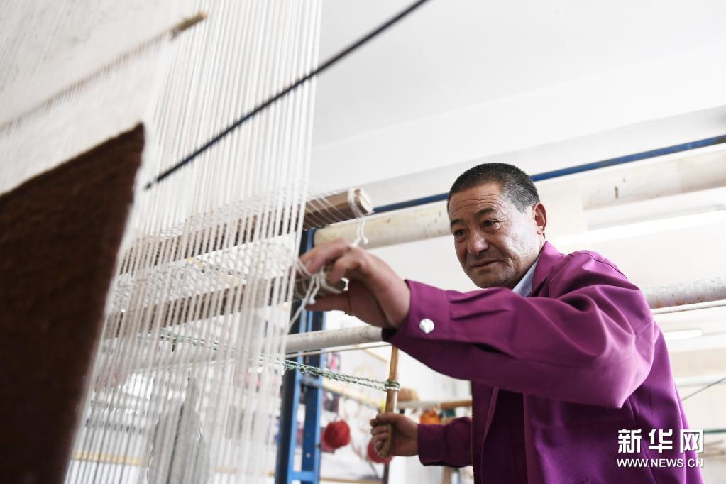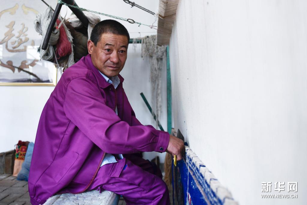 6月5日,在西寧市湟中縣上新莊鎮(zhèn)加牙村,楊永良在制作藏毯。新華社記者 張龍 攝