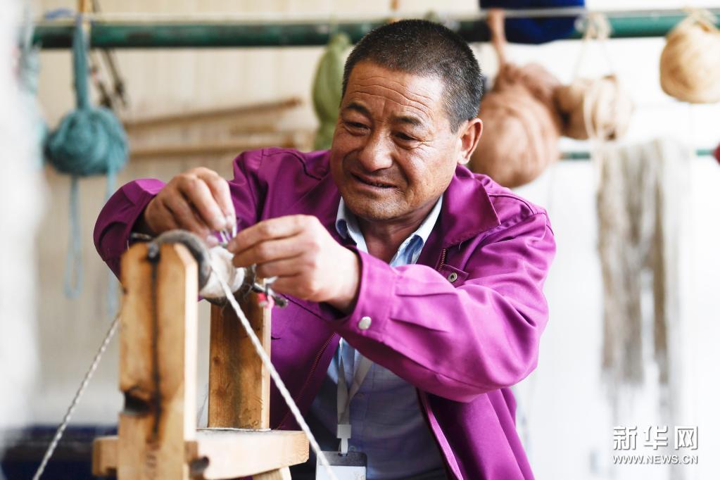 6月5日,在西寧市湟中縣上新莊鎮(zhèn)加牙村,楊永良在捻線。新華社記者 張龍 攝