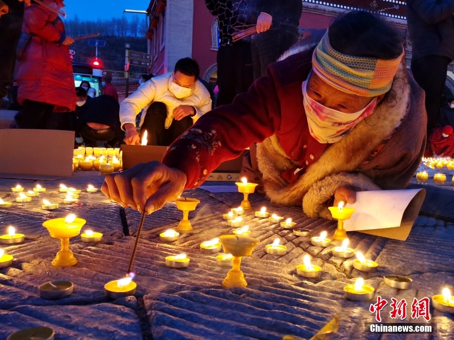 記者在塔爾寺內(nèi)看到,裹著藏袍的藏傳佛教信眾,扶老攜幼,在寺院山門處的標(biāo)志性建筑八寶如意塔周圍的地面燃燈,并在高原冷風(fēng)中虔誠守護(hù)。