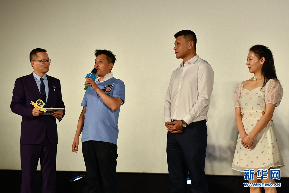 6月30日,《我的青海》導(dǎo)演張偉國(左二),主演單寶中(右二)、鞠可兒(右一)在首映式上分享影片創(chuàng)作經(jīng)歷。新華網(wǎng) 潘彬彬 攝