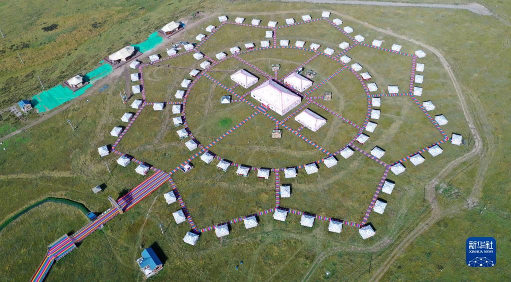 這是甘肅省甘南藏族自治州碌曲縣尕海鎮(zhèn)尕秀村帳篷城景區(qū)(無人機照片,2021年9月9日攝)。新華社記者 陳斌 攝