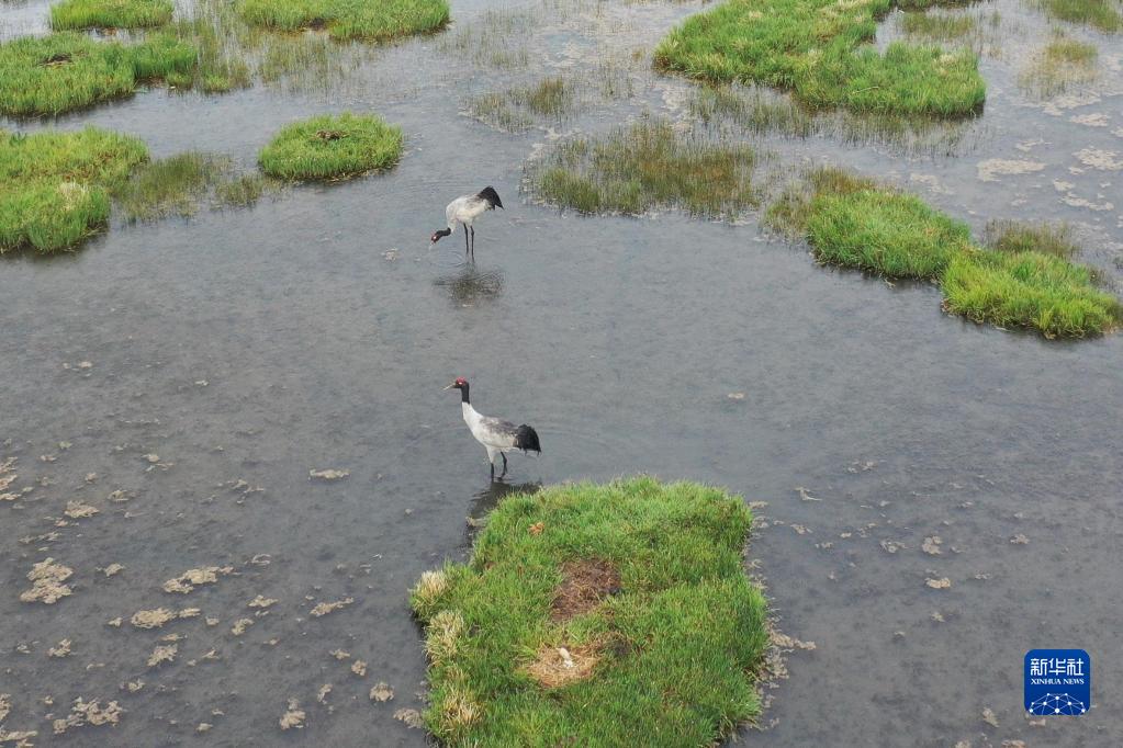 這是在甘肅省甘南藏族自治州碌曲縣尕海湖拍攝的國家一級保護動物黑頸鶴及其幼鳥(無人機照片,2021年6月2日攝)。新華社記者 杜哲宇 攝