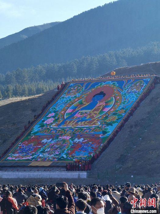 2月3日,中國(guó)農(nóng)歷正月十三,時(shí)隔三年,有“世界藏學(xué)府”之稱的甘肅拉卜楞寺重啟“瞻佛”活動(dòng),當(dāng)日展曬的巨型唐卡佛像吸引7萬余僧俗民眾慕名瞻仰,祈禱新年風(fēng)調(diào)雨順、國(guó)泰民安。中新社發(fā) 屈鵬 攝