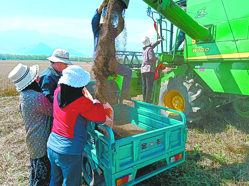 門源縣浩門鎮(zhèn)小沙溝村村民們正使用合作社的收割機(jī)收割莊稼。