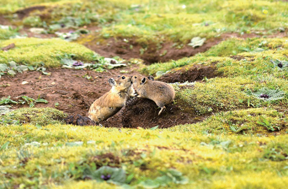 兩只高原鼠兔在西藏思金拉錯(cuò)湖邊嬉戲。新華社記者 周錦帥 攝