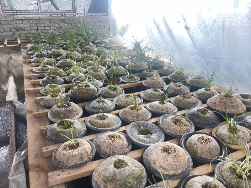 來到臘八山村的蘭花種植戶古紹林家中,他正在蘭棚里管理“蘭寶寶”。他的蘭棚建在自家樓頂上,架子上大大小小的花盆里種滿了高高低低的蘭花,青綠色一片。古紹林一面護(hù)理花苗一面說道:“別看這小小一盆蘭花,它讓我們大伙兒都走上了致富路。我每年賣蘭花收入40多萬元,跟著我一起種蘭花的差不多有將近50個村民,人均增收達(dá)上萬元。”