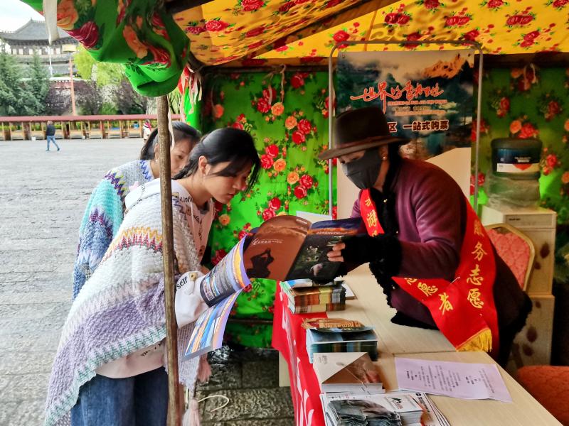 在服務(wù)點,游客可以獲取香格里拉各旅游景點、旅游路線和當(dāng)下活動的信息介紹,以及景區(qū)門票預(yù)訂指引,還可隨意取閱各類旅游宣傳手冊、旅游地圖和旅游書籍等。來自廣州的游客李先生通過服務(wù)點志愿者的指引到古城旅游服務(wù)中心購買了至普達(dá)措景區(qū)的直通車票和景區(qū)門票。“之前不太了解,到這兒問了問才知道,可以直接搭乘景區(qū)大巴車到普達(dá)措,這樣方便了不少。”李先生說。