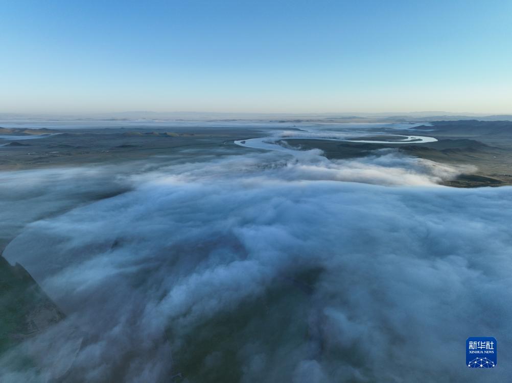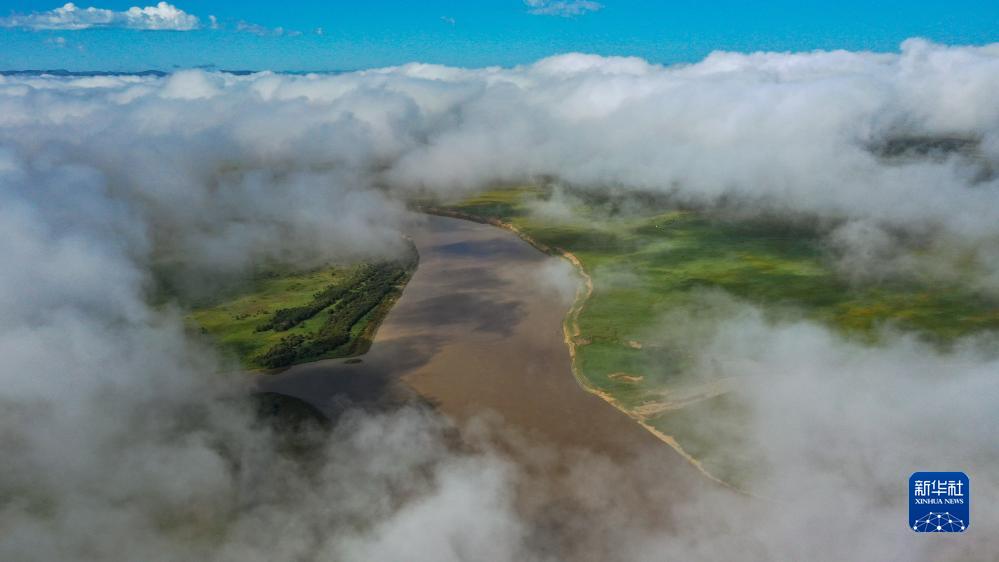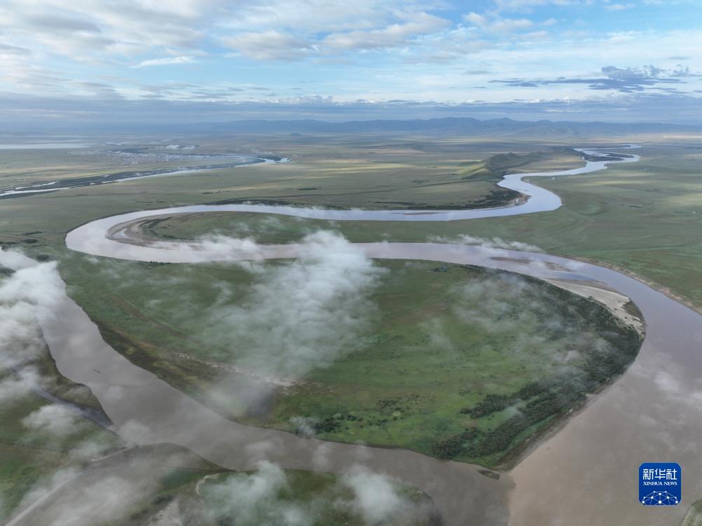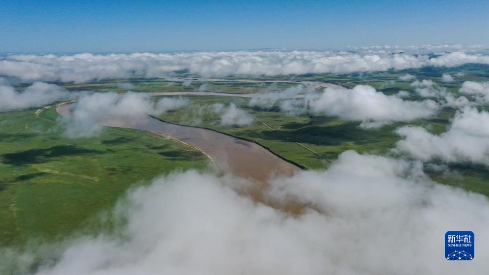 這是8月22日清晨在四川省阿壩藏族羌族自治州若爾蓋縣唐克鎮(zhèn)拍攝的黃河九曲第一灣景色(無人機照片)。新華社記者 邢廣利 攝