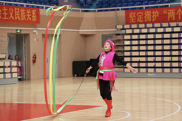 9月18日,少數(shù)民族傳統(tǒng)運動會表演項目——民族健身操比賽在五鳳山民族體育中心體育館舉行。