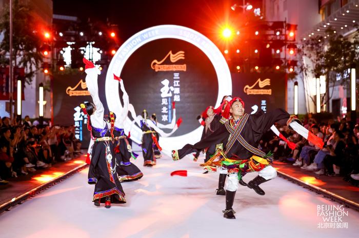 走秀轉(zhuǎn)場間,輕快的鼓點(diǎn)、揮舞的長袖、富有磁性的吟唱聲,熱情洋溢的藏族甩袖舞點(diǎn)燃了夜晚的王府井大街,讓人仿佛置身于少數(shù)民族節(jié)日的喜慶氛圍。