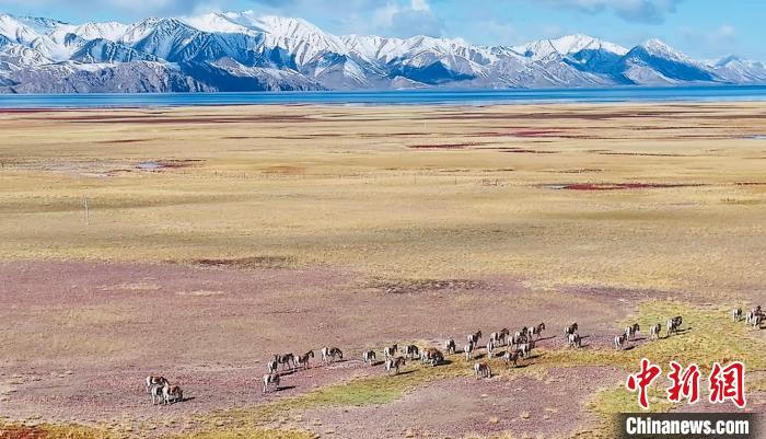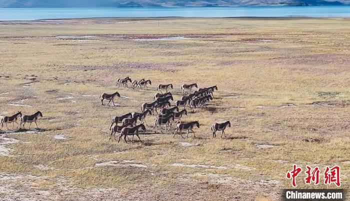 圖為無人機航拍成群藏野驢在湖邊漫步。 瑪多縣委宣傳部 供圖
