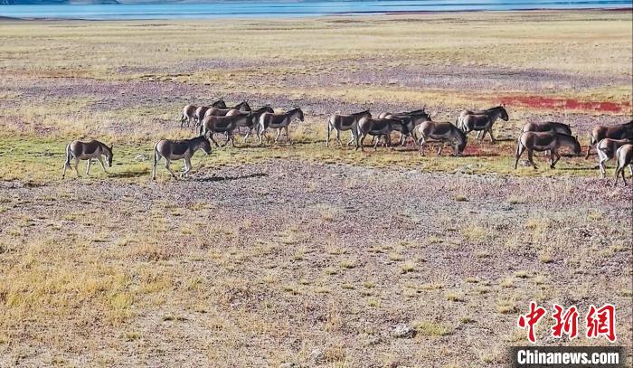 圖為成群藏野驢在湖邊覓食。 瑪多縣委宣傳部 供圖