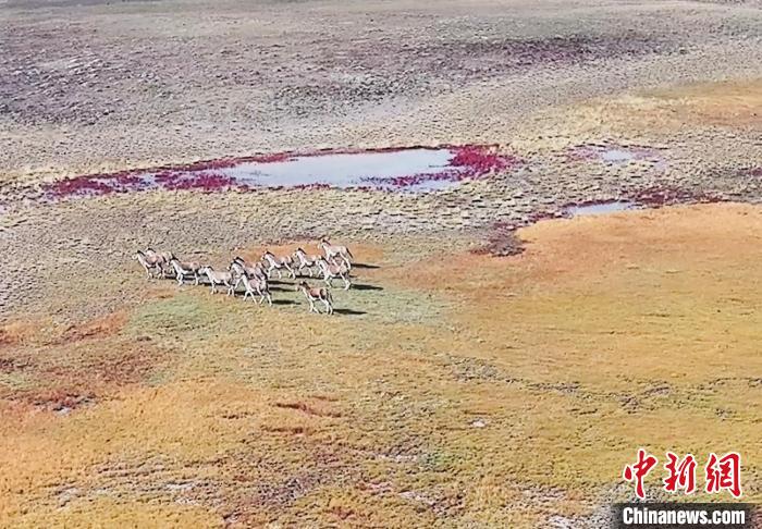 圖為無人機航拍成群藏野驢在湖邊覓食。 瑪多縣委宣傳部 供圖