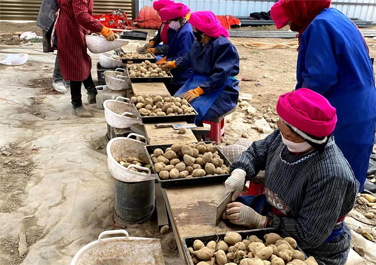 香格里拉市虎跳峽鎮(zhèn)紅旗村村民康猛組織30多位處于農(nóng)閑的村民在馬鈴薯基地里務(wù)工,他一邊手持筆記本記錄袋數(shù)一邊介紹:“一個(gè)人每天可以收220袋左右,現(xiàn)在已經(jīng)收了30天,大概還要收30多天才能收完,光靠幫別人收馬鈴薯,每人每年收入三四萬(wàn)元。”