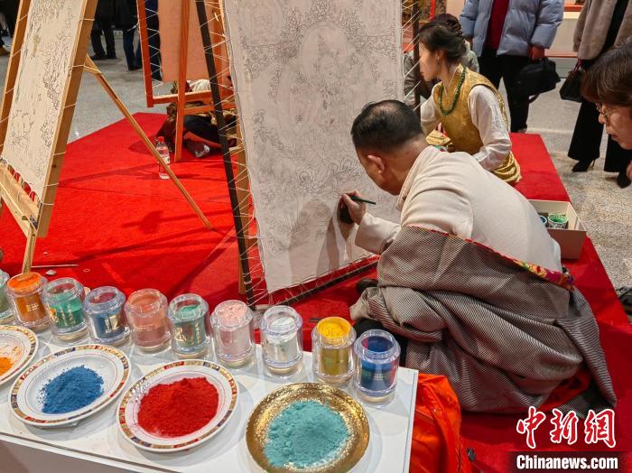 “此次成果展集中展示了熱貢藝術(shù)傳承千年的文化脈絡(luò)與精湛技藝,展現(xiàn)了當(dāng)代熱貢唐卡藝術(shù)的傳承活力與創(chuàng)作實(shí)績(jī)。除展品外,觀眾還可以觀看熱貢壁畫數(shù)字化展示和專題紀(jì)錄片,更加深入了解熱貢藝術(shù)?!敝袊?guó)非物質(zhì)文化遺產(chǎn)館副館長(zhǎng)、展覽策展人王輝說。