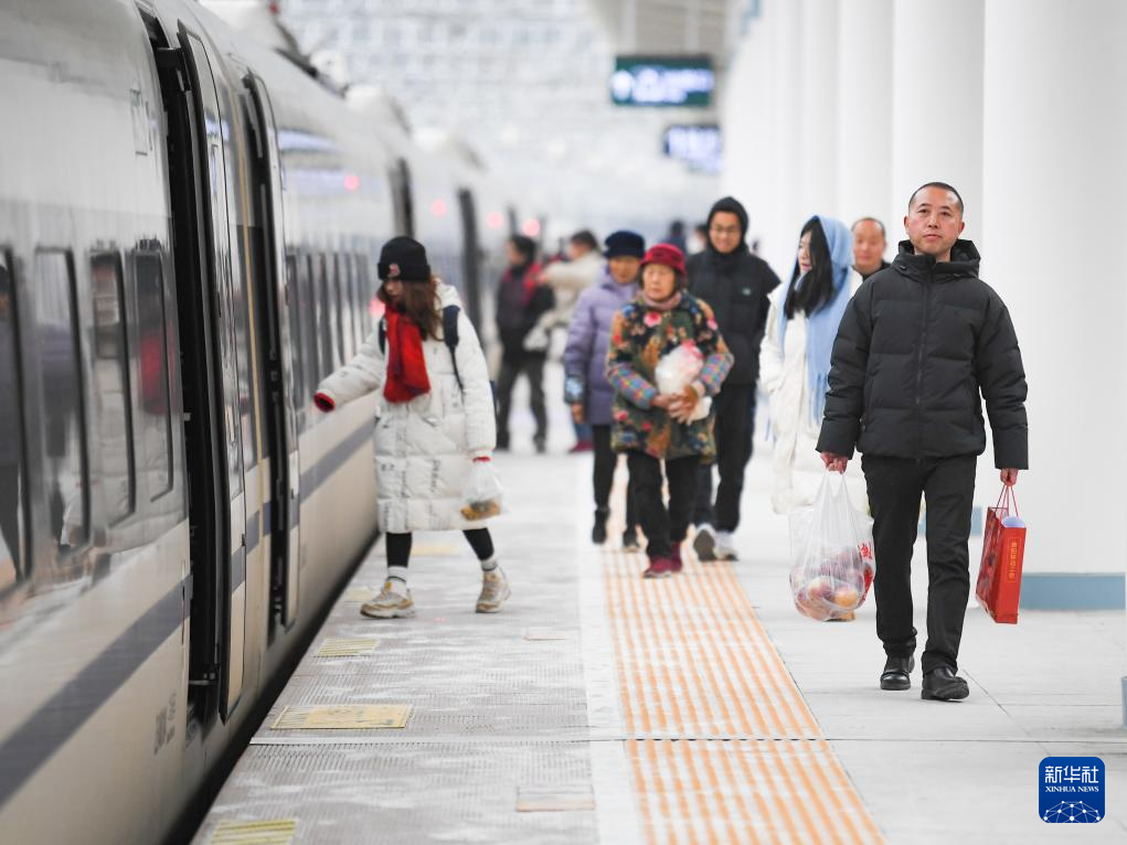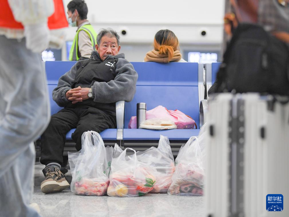1月28日,在川青鐵路茂縣站,旅客帶著購買的牦牛肉和蘋果在候車。新華社記者 王曦 攝