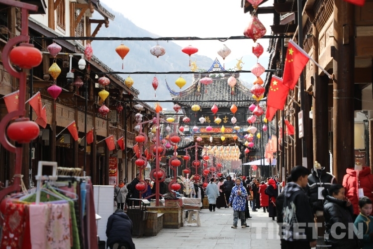 今年春節(jié),身著藏族、回族等民族服飾的本地居民漫步穿梭在古城內(nèi),他們或在三五成群的聊天逗笑,或在道路兩邊的商鋪小攤購(gòu)買(mǎi)挑選,或在熱情洋溢地排練元宵歌舞。古城的街道寬闊,鋪就的石板路光滑平整,每條街道整片掛滿了帶有新春氣息的古樸燈籠。