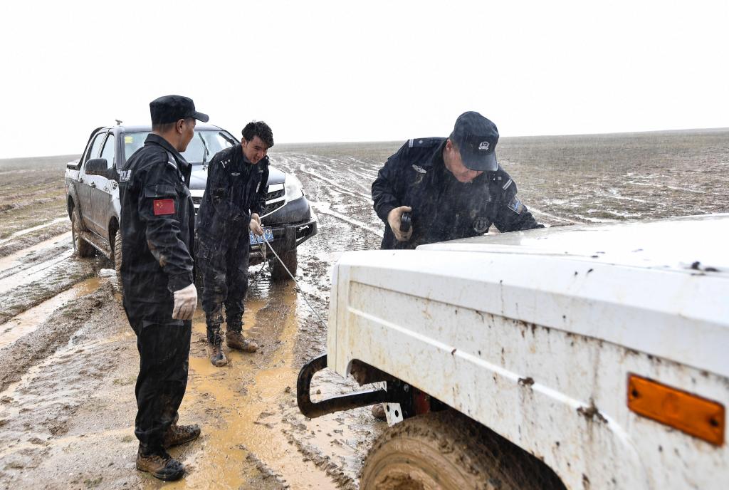 2020年7月6日,卓乃湖保護站站長秋培扎西(右)和巡山隊員更松多杰(左)、白瑪東周在可可西里地區(qū)冒雨拉車。新華社 張龍 攝