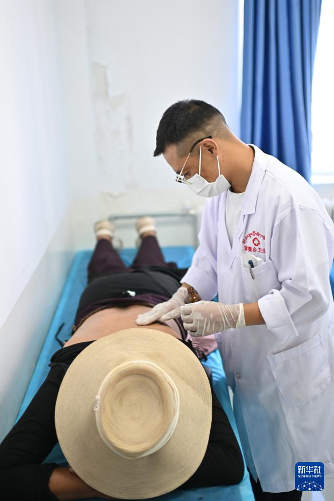 7月31日,青海省果洛藏族自治州達日縣窩賽鄉(xiāng)衛(wèi)生院醫(yī)生夏吾南加在為患者進行藏醫(yī)理療。新華社記者 張龍 攝