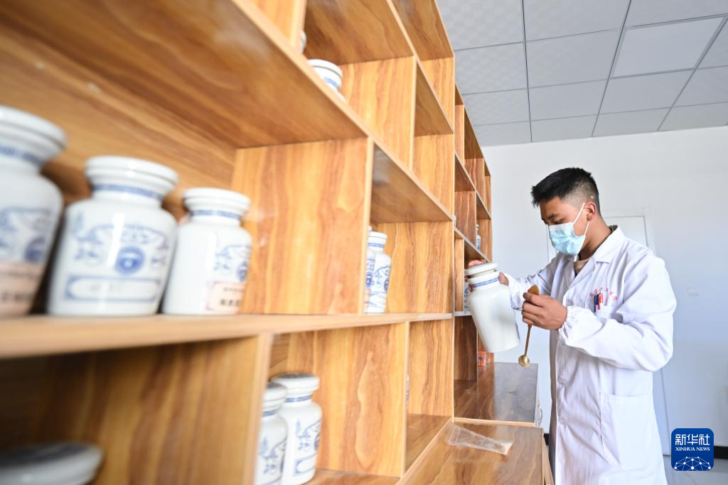 7月31日,青海省果洛藏族自治州達日縣窩賽鄉(xiāng)衛(wèi)生院醫(yī)生華多在為患者配藏藥。新華社記者 張龍 攝