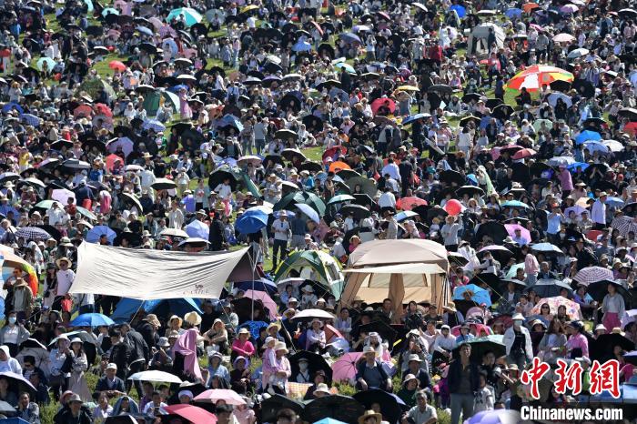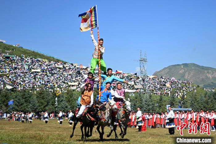 8月4日,第22屆九色甘南香巴拉旅游藝術(shù)節(jié)在甘肅省甘南藏族自治州當周草原開幕。人們身著節(jié)日盛裝載歌載舞、歡聚一堂,馬隊巡游、千人鍋莊舞等活動精彩上演。九色甘南香巴拉旅游藝術(shù)節(jié)既是民眾浪山聚會的節(jié)日盛會,也是展現(xiàn)發(fā)展成就、擴大對外開放的重要窗口,更是展示民俗文化、促進廣泛交往交流交融的有效載體。(無人機照片)中新社記者 九美旦增 攝