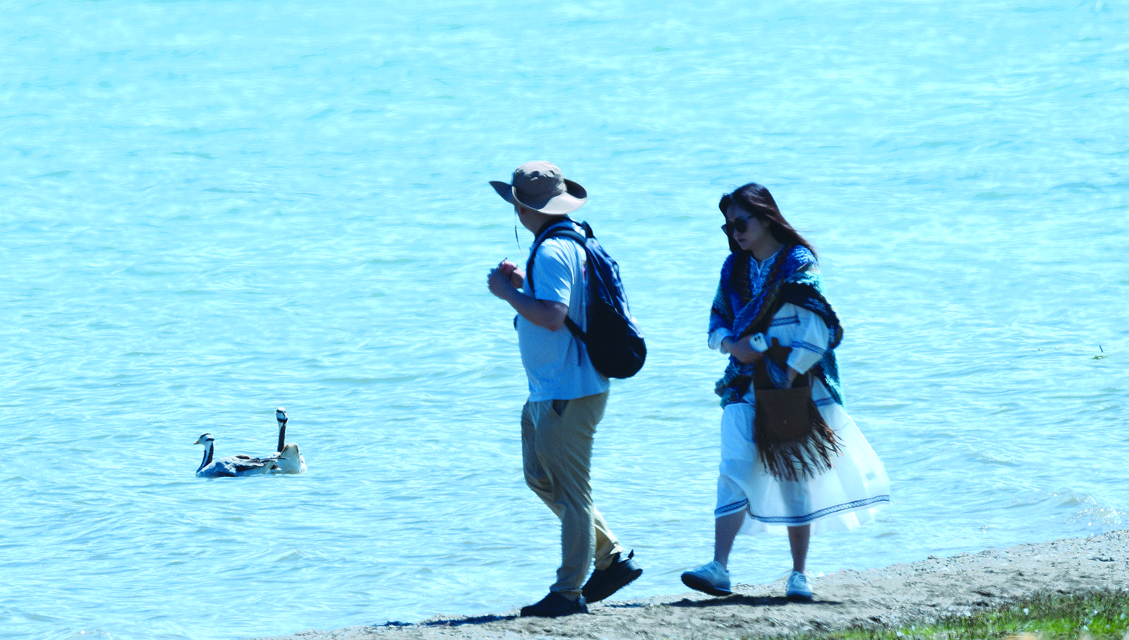 黑馬河敖包觀景點每天的客流量較大,也因此成為了斗格才讓夫妻的重點巡護區(qū)域。一天,巡護途中,斗格才讓突然放慢了腳步、壓低了聲音,原來是發(fā)現(xiàn)了一群斑頭雁在湖邊“散步”,他詳細地記錄到了巡護日志里。