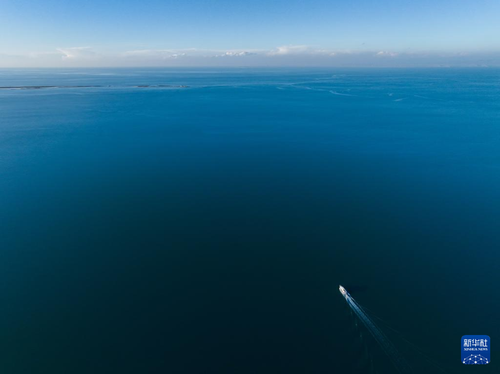 10月18日,一艘游輪行駛在青海湖二郎劍景區(qū)(無人機照片)。新華社記者 呂帥 攝