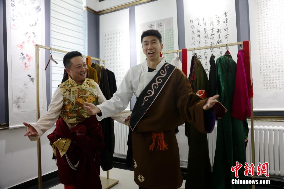 圖為里約奧運(yùn)會(huì)跆拳道冠軍趙帥(右)體驗(yàn)藏族服飾。中新社記者 張?zhí)砀?攝