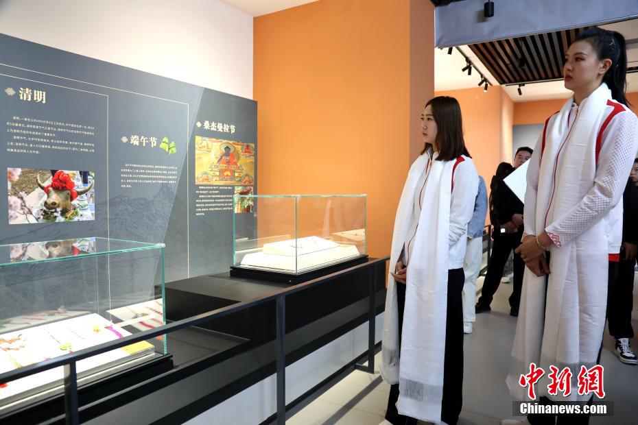 圖為巴黎奧運(yùn)會(huì)花樣游泳冠軍王賜月(左)、里約奧運(yùn)會(huì)女排冠軍張常寧參觀海南州民族文化展覽。中新社記者 張?zhí)砀?攝