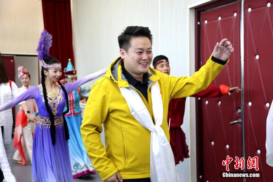 圖為北京奧運(yùn)會(huì)蹦床冠軍陸春龍跟海南州民眾跳鍋莊舞。中新社記者 張?zhí)砀?攝