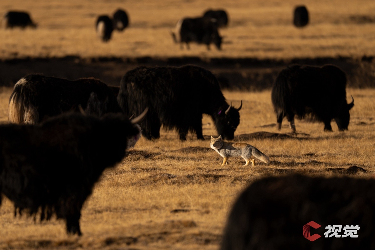 藏狐悠然穿過牦牛群。