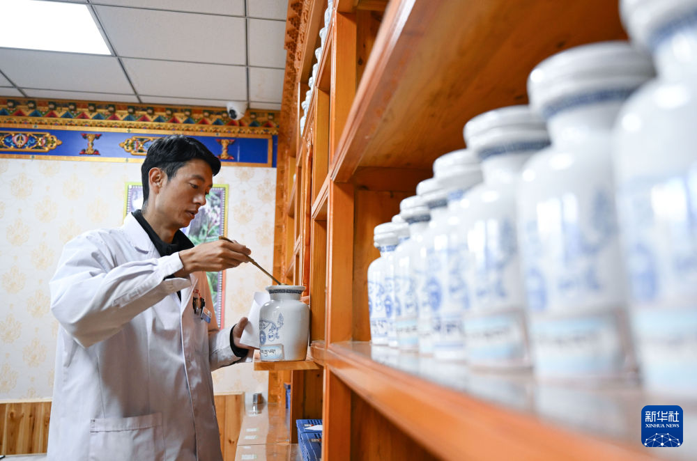 12月17日,在青海省海南藏族自治州共和縣倒淌河鎮(zhèn)中心衛(wèi)生院,醫(yī)生索南多杰在配制藏藥。新華社記者 張龍 攝